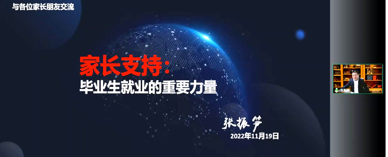 11月19日19时,学校2023届毕业生“云”家长会在线举办,6100多位家长,学校各专业教师、生涯导师、辅导员等在线参加。学生发展中心徐立志主持会议。