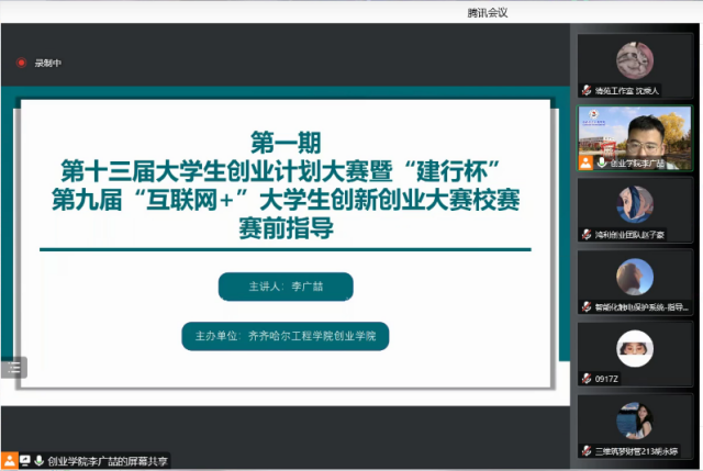 11月10日,创业学院线上开展第一期第十三届创业计划大赛暨第九届“互联网+”大赛赛前指导活动。科技园李广喆老师做主讲教师,各项目成员与指导教师一同入会参加本次培训,齐工程双创团队联盟学生、创业团队全员参会。