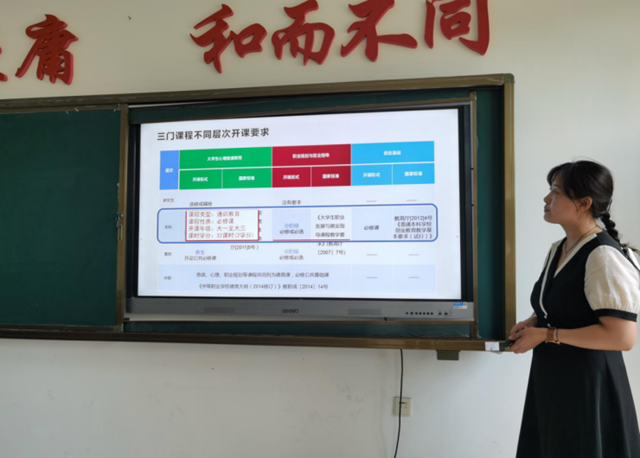 首先,康静老师用PPT详细介绍讲解《职业规划与就业指导》课程,部门其他两位教师按照课程定位、课程设计、课程实施、课程评价四要素展开自己的说课。付东双老师的《大学生心理健康教育》,李玉焕老师的《创业基础》分别运用PPT逐一展示讲解。在讲解中,以学生发展为中心,以学生兴趣为出发点,形成相应的“门课矩阵”和“专题矩阵”。大家认为说课优化了教法与学法,对学习产出标准进行了细化,注重学生学习效果的测量,三位教师互评,对说课相关内容相互提出修改意见。