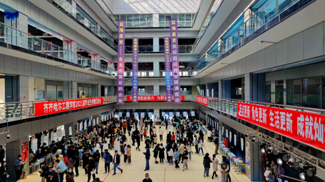 4月13日下午,学校与市工信局、团市委、市新闻传媒中心携手我市74家企业,走进校园共同举办2021年齐齐哈尔“益海嘉里杯”校园专场招聘会。