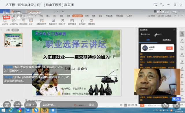 4月23日晚,由学生发展中心主办的“职业选择”云讲坛系列活动在钉钉信息化平台启动,齐市龙沙区武装部政委尚晓伟应邀为300余名应届毕业生作“入伍即就业”专题报告。
