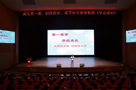 学校特别邀请创校校长、理事长曹勇安教授,校党委书记郭伟东分别以《学会成长》《扣好人生第一粒扣子》为题为新生开展开学第一课。曹勇安通过学校成长、个人成长两个篇章为新生阐述什么是“海绵式”学校、“创业型”大学。如何进行岗位创业独立创业。帮助新生深入了解学校文化,树立正确理想信念。郭伟东围绕坚定理想信念、厚植家国情怀、练就过硬本领、做到知行合一四个方面展开深入讲解,希望全体新生要有实现中华民族伟大复兴的使命与担当。