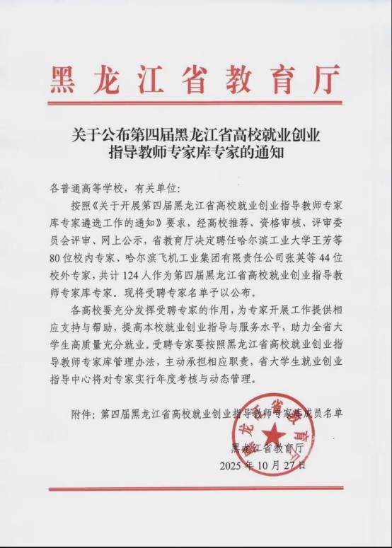 10月27日,黑龙江省教育厅传来喜讯,在《关于公布第四届黑龙江省高校就业创业指导教师专家库专家的通知》中,我校监事会主席张振笋、学生发展中心主任康静凭借深厚的专业素养和丰富的实践经验,成功入选,荣聘为第四届黑龙江省高校就业创业指导教师专家库专家。