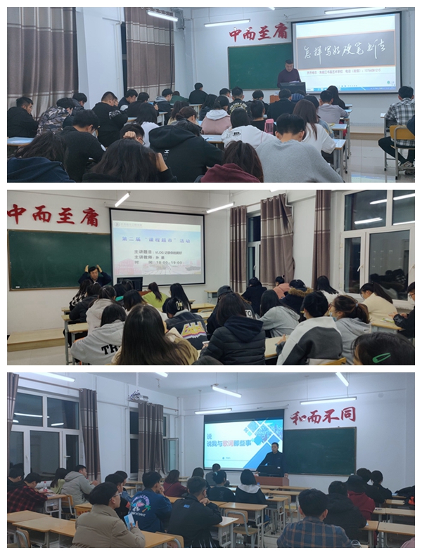 在艺术板块中,邀请了齐市书画家朱毅江主讲《怎样写好硬笔书法》、工艺美术师高天阁主讲《扇面画颜色过渡技法》、新华社签约摄影师李贺主讲《摄影中的光影交错》、老年大学音乐教师肖宝臣主讲《人人都可以成为歌手》、“大鹏开讲”公众号博主孙鹏主讲《VLOG记录你的美好》、校宣传部尹剑飞主讲《说说我与歌词那些事》、兼职教学督导戴凤彬主讲《手机摄影小技巧》;在自我认知领域中,由颖泰心理服务中心主任张颖主讲《提升自我认知 尊重与他的边界》、学生发展中心教师付冬双主讲《自我探索团体辅导》;在体验职业方面,由信息工程系教师刘晓丹、机电工程系教师王珊珊从不同的职业认知角度进行了分享。