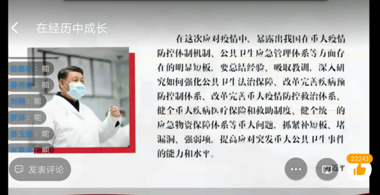 5月28日晚,由学生发展中心生涯教研室毛语桐老师开展的疫情防控主题实践课在钉钉线上平台展开,本次活动的主题为“在经历中成长”共分为两场分别面向2018和2017级全体同学展开。在这场突如其来的疫情中,是留给大家2020年的一个不一样的挑战,每一个人对此都有不同的感受和想法,老师通过和大家分享在抗击疫情中武汉这座城市,让大家感受一个不一样的英雄城市,让大家去反思如何在疫情中做到“事事关心,人人尽力”,如何在这次全民抗疫的过程中去成长。对此,同学们也是纷纷的表达自己的见解与感受。通过本次活动,也让同学们去反思自己在疫情中要做什么,如何做以及怎样做。
