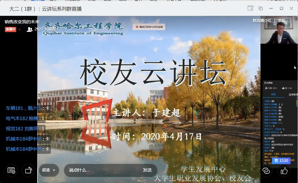 4月17日晚18:30分,学生发展中心为在校生举办第一期“校友云讲坛”活动。本期活动邀请我院建筑工程系建筑工程专业2010级学生,现任北京昕熹伟业总经理,同时也是最早为为我院捐赠防疫物资的于建超校友来进行“创业,改变我的未来”主题分享,共有3500余人在线聆听本次讲座。