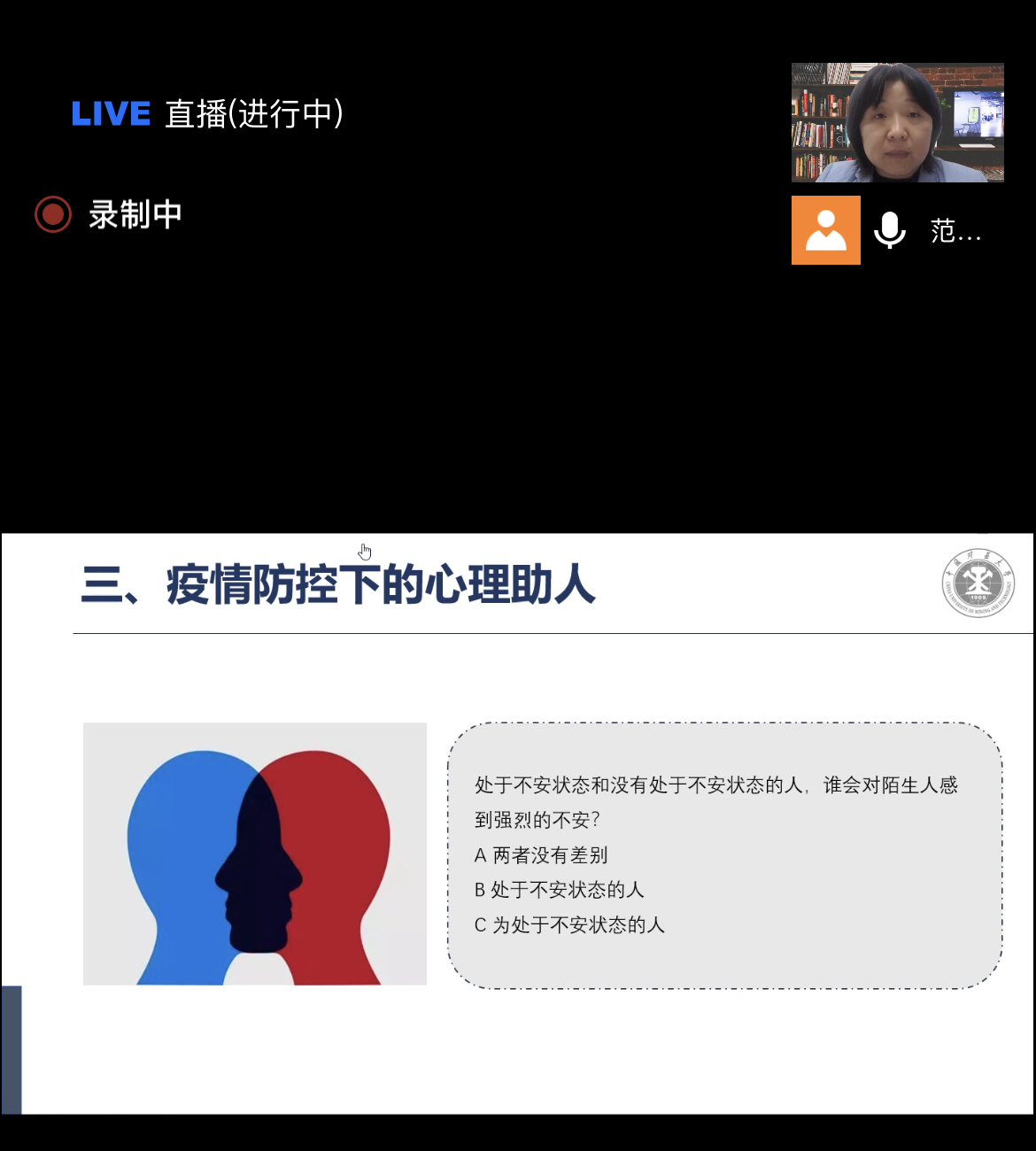 讲座主讲人范韶维教授是中国矿业大学大学生心理健康教育中心副主任,中国心理学会注册心理师,她从疫情防控下的心理影响、疫情防控下的心理自助与疫情防控下的心理助人三个方面,与学生探讨当前疫情下同学们的心理健康状态,并针对性地提出解决办法,她认为心理服务要多观察同学们心理状况,不要只看表面,理解、无条件关注与同理心沟通是心理助人的重点,允许自己有恰当的情绪。