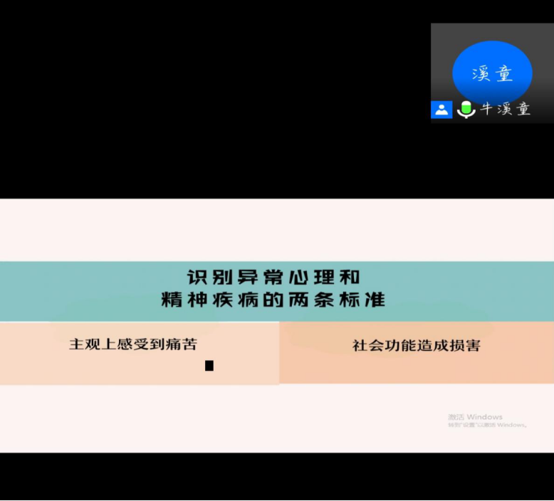 本次线上讲座活动由心理老师牛溪童主持,参与人员为相关医学专家、本校老师与各级学生。活动从三个方面展开。首先是主讲老师的牛溪童老师的自我介绍,为我们介绍了她的求学经历以及学术成就,向我们充分展示了努力的成果;其次正式开始讲座,第一个内容是由老师介绍异常心理的标准解读、相关书籍、产生原因、识别标准并结合自身经历举例让我们能更好的理解和记忆。第二个内容是常见的精神疾病。主要讲解了双相障碍且与抑郁障碍和精神分裂区别,通过参与人员的提问和经历介绍了创伤及应激相关障碍,并提出了科学的解决方法。第三个内容是常用干预手段,主要是心理治疗、药物治疗、物理治疗和预后康复并依次讲解每种方法的使用措施以及准备工作。第四个内容是表明举办讲座的目的和意义是为了消除对精神疾病的妖魔化、病耻感、增加科学认知并结合自己所学帮助他人的目标。最后是答疑时间,牛溪童老师解答提出的有关心理学的相关问题和自己的求学经历拉近与参与人员的距离,让参与者在轻松愉快的氛围中学习到知识。