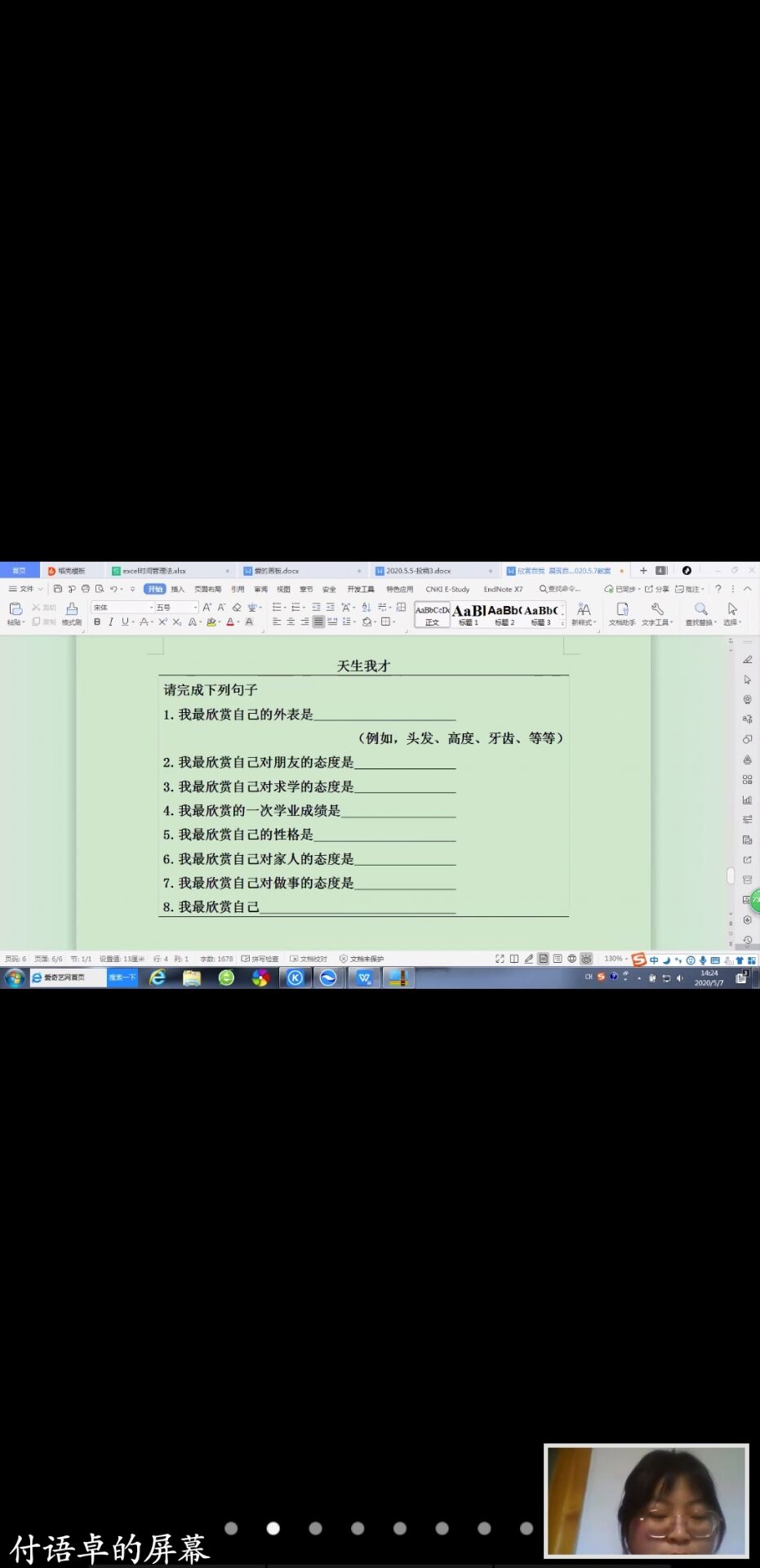 本次团体辅导课开始前付老师带领同学们进行热身活动“知你识我”,利于同学们在分享中认识自我和了解他人。活动过程中,老师组织同学们填写“天生我才”练习表,帮助同学们更深层次的了解自身优点,相信“天生我材必有用”,每个人对于社会都是有价值的。活动后期,每个人分享自己的“五个最”即最自豪的事、最遗憾的事、最感动的事、最想感谢的人以及大学期间最想做的事”,从而更好的挖掘自身资源面对未来。