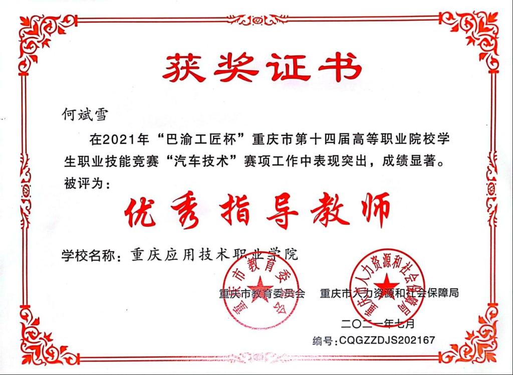 在重庆应用技术职业学院,何斌雪怀着对党的忠诚、对职业教育的热爱,刻苦钻研业务,从一名普通教师成长为职业教育领域的优秀人才,在平凡的岗位上创造了可喜的业绩,曾指导学生获得重庆市市级职业技能竞赛一等奖1次、二等奖3、三等奖1次,国家行业级职业技能竞赛三等奖2次;先后获得2021年度优秀共产党员、2021-2023年度优秀教师、2021年重庆市职业技能竞赛优秀指导教师、2023年中共重庆市委教育工作委员会优秀共产党员称号。