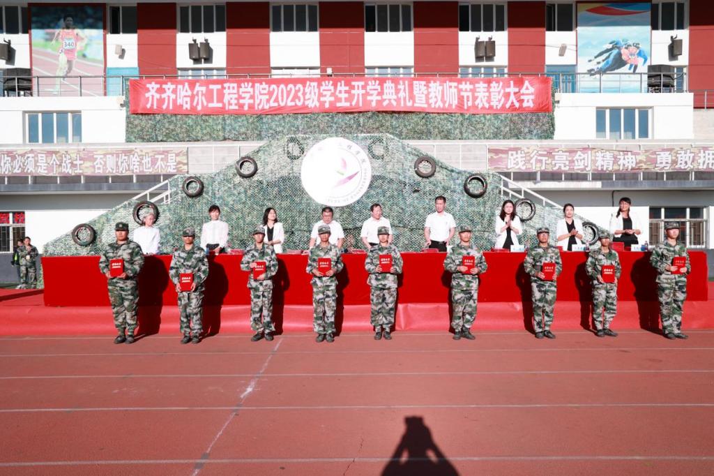 党委书记郭伟东宣读《关于表彰2023级学生军训先进集体及先进个人的决定》,对在本次军训工作中取得突出成绩的先进连队和先进个人予以表彰。机电工程系一营一连等10个连队被评为2023级学生军训优秀参训连队;建筑工程系三营十六连等6个集体被评为2023级学生军训内务检查先进集体;774名学生分获各项个人荣誉。