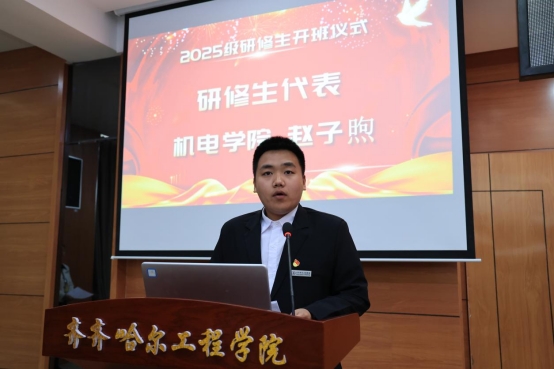 研修生代表、机电学院赵子煦发言,他表示,研修学习是一段充满挑战与机遇的征程,希望同学们珍惜宝贵的研修时光,充分运用学校的优质资源,夯实专业基础。同时激励大家以教育家精神为指引,以双师素养为支撑,在产教融合的时代浪潮中勇毅前行。