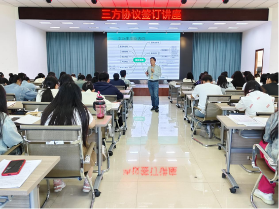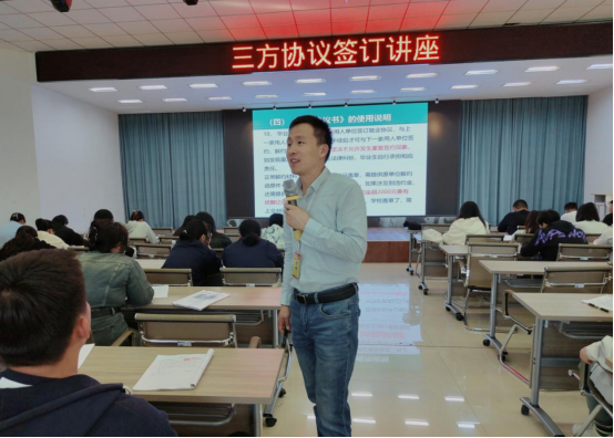 5月7日,学生发展中心在二号教学区2508会议室举办三方协议签订讲座。学生发展中心徐立志老师主讲,大三年级一百余名学生到场聆听讲座。