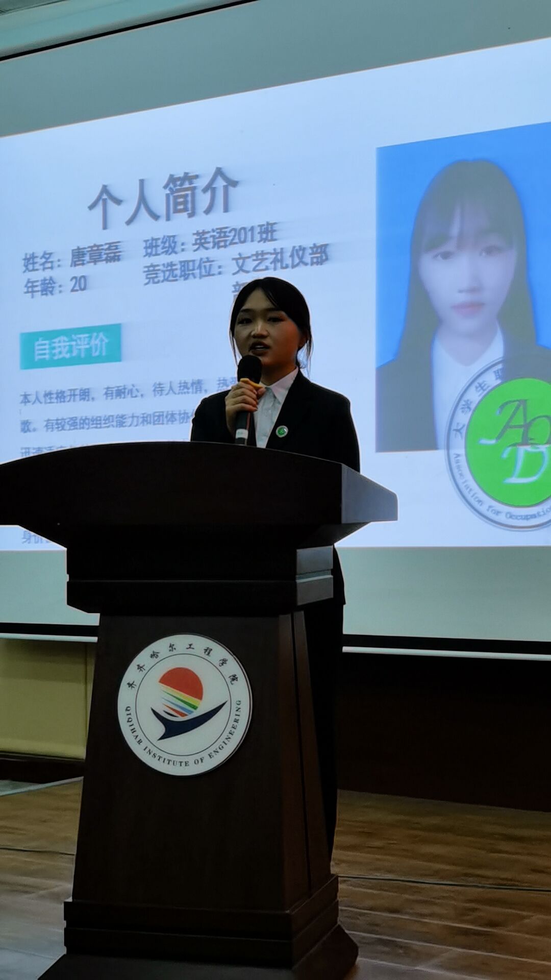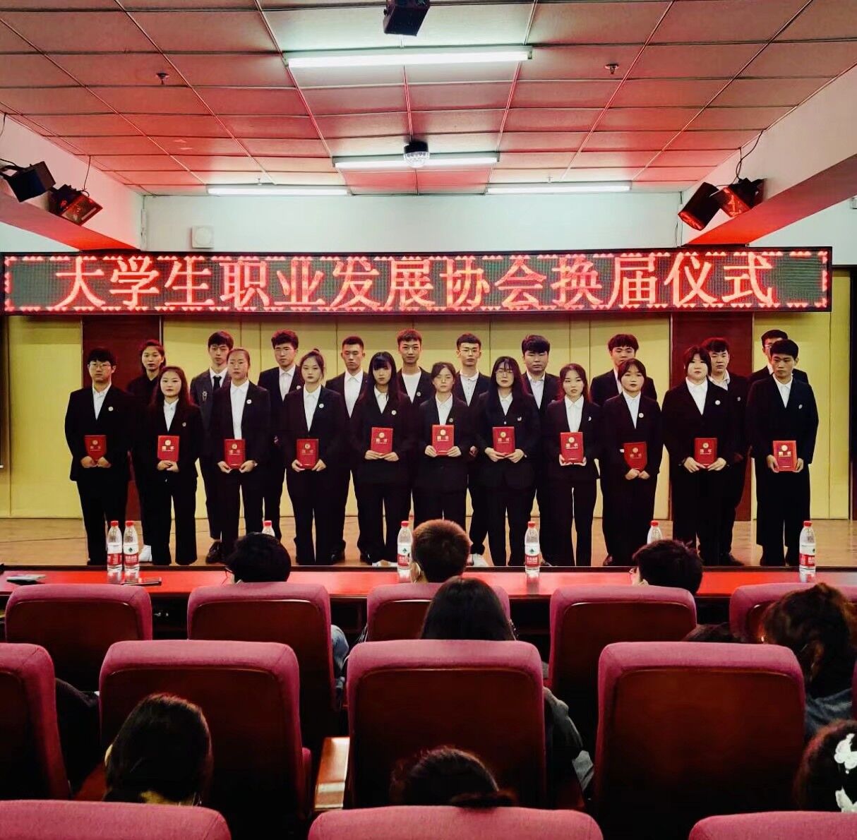 首先是各竞选人上台演讲,演讲内容都表达出对未来工作的美好展望,提出建设性意见,给大家未来的努力提供了方向,四位会长的工作总结更是深入人心。仪式中安排了精彩的歌舞表演,使现场气氛持续高涨。紧接着屏幕上开始放映毛语桐老师精心录制的视频,为同学们送出祝福同时也祝职展蒸蒸日上。仪式的最后由牛轶慧老师上台发表精彩演讲并合影留念,此次换届仪式圆满结束。