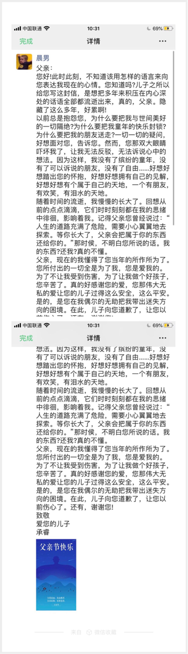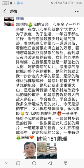 同学们通过多种方式向父亲表达爱意,一段段文字,一张张合影,传递着真挚的祝福,每一张老照片都是父亲独特的记忆,爱要写下来,同学们也用文字这一种方式和父亲对话,其中健管181周瑶写到“在我的眼里您就是一颗茁壮的大树,呵护着您的幼儿,您用您的身躯挑起整个家的重担,是您鼓励我让我一步步走向大学的殿堂,教我学会独立,学会成长”。